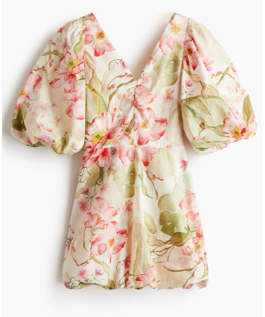 Short dress in a cotton weave with a V-shaped neckline, gathered seam at the centre of the bust and wide straps that tie in a bow at the back. Covered elastication at the back of the waist and a concealed zip at one side. Elbow-length balloon sleeves and a bubble hem that create a puffy silhouette. Lined.
